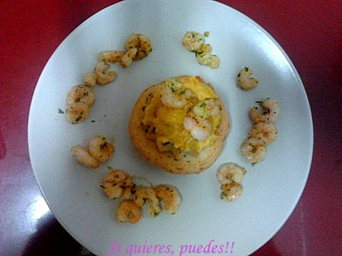 Ponemos en el centro de los Muffins ( en mi caso como son en forma de volcán) un poco de crema y decoramos con gambas por encima y en los platos individuales y listos para comer!!.